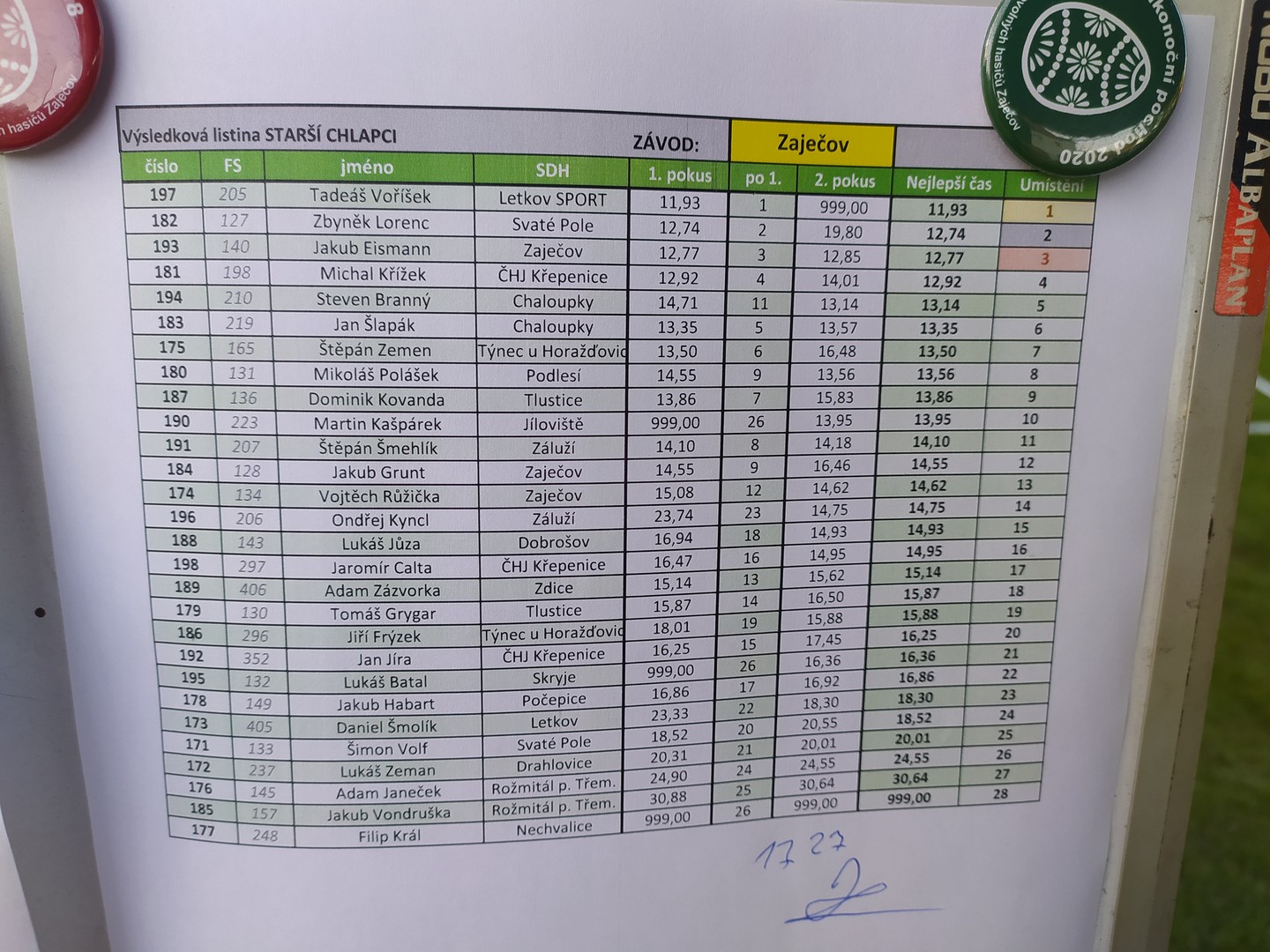 Velké poděkování patří Jan Balcárek a Filip Tamchyna. Bez nich bysme takovéhle časy nikdy neměli. Mají s námi trpělivost a trénují s námi, co to jde. Děkujeme
