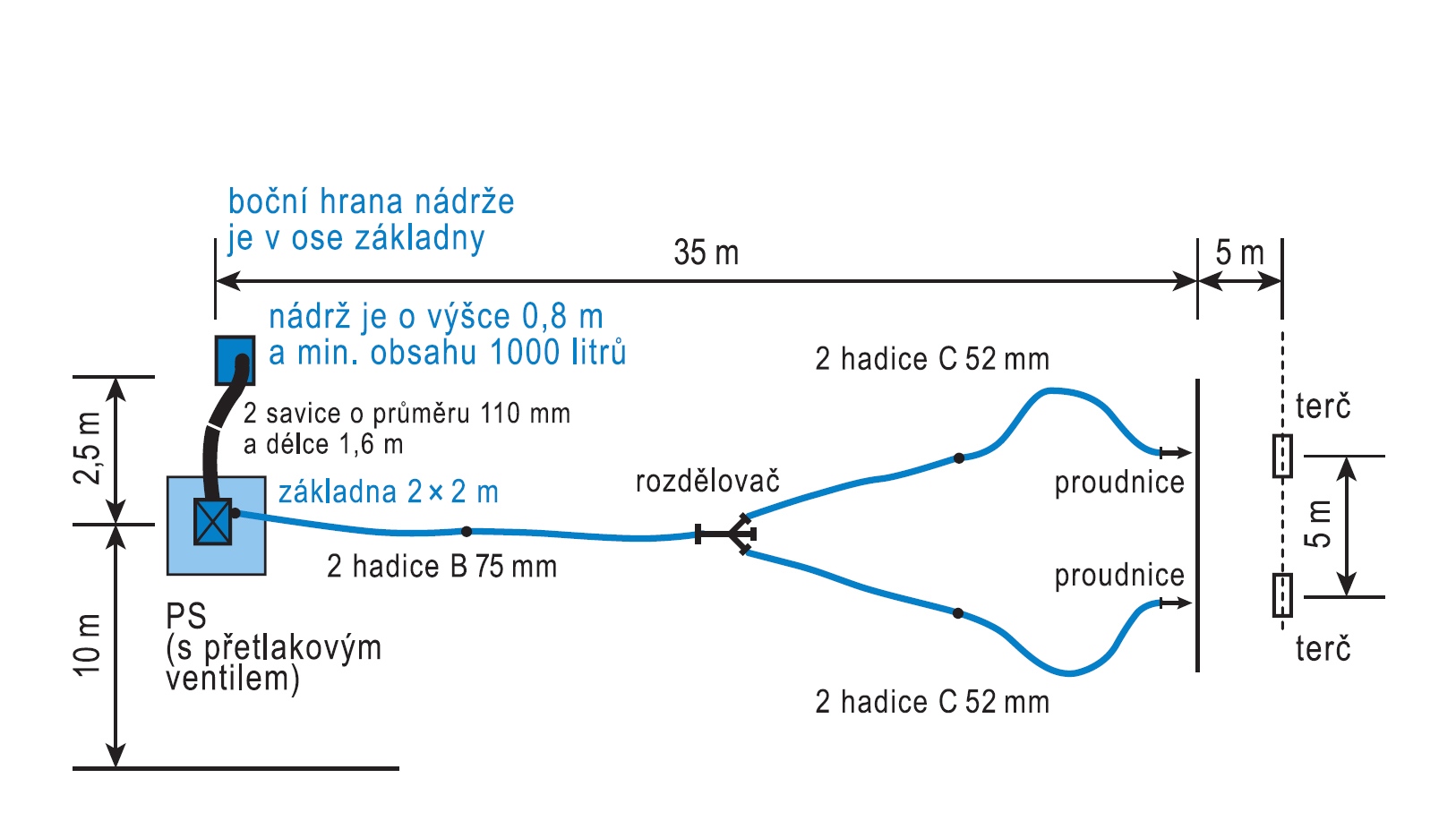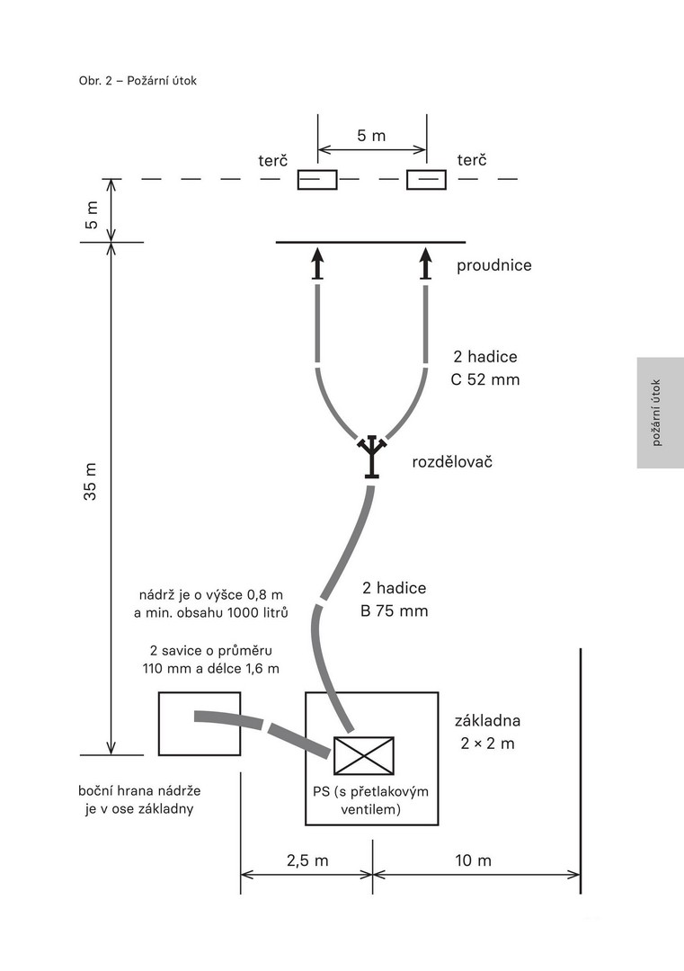 Požární útok provádí sedmičlenné družstvo. Úkolem je sestavení přívodního, dopravního a útočného vedení, kterým je dopravena voda od kádě až k terčům. Přívodní vedení je tvořeno sacím košem a dvěma savicemi. Od motorové stříkačky pokračuje dopravní vedení složené ze dvou hadic B a rozdělovače. Útočné vedení představují dva páry hadic C a dvě proudnice. Stříká se na plechovky, většinou ale na nástřikové terče. Kategorie mladších má dospělého strojníka a sešroubované savice.